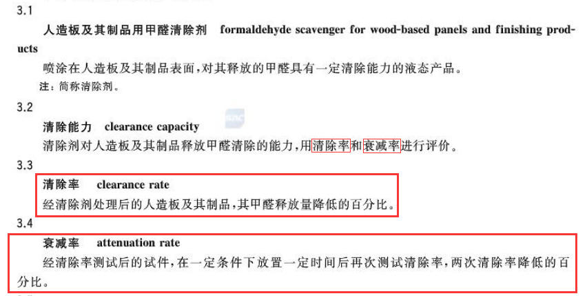 根據國家標準,驗證人造板甲醛清除劑的清除能力的有兩個指標非常重要,一個是測定24小時效果的“甲醛清除率”,還有一個測定長期效果的“衰減率”?!八p率”就是在7天之后,再測一次甲醛清除率,然后把7天后的甲醛清除率與24小時的甲醛清除率作比較,看前后兩次清除甲醛的效果降低了多少,計算出來的降低比率就是“衰減率”。